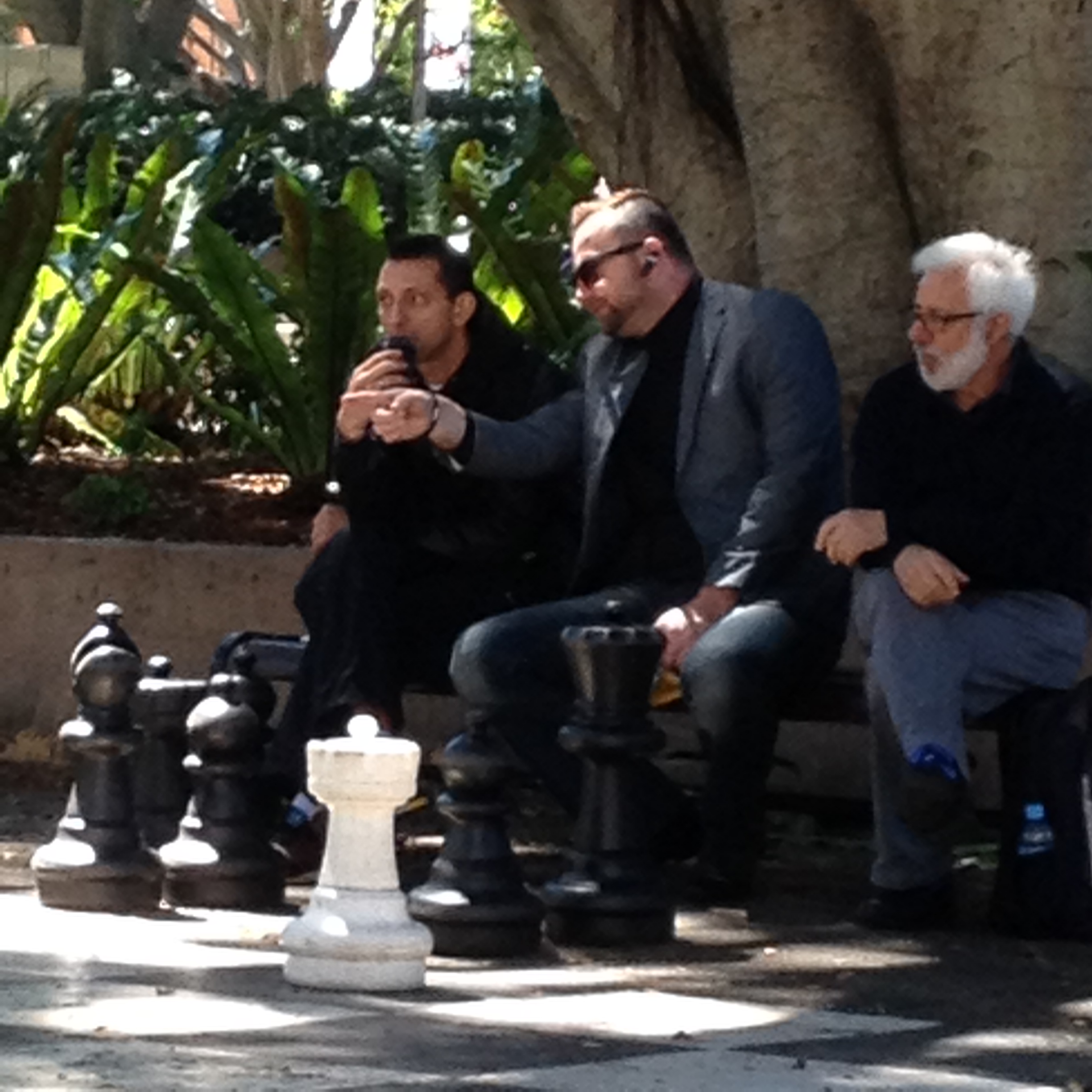The two men and their advisors played it out until it had been proven that the old man had won. The young man bowed, his theatrics coming off as gracious, not rude, and the old man took off his hat to his opponent. Then he walked over to his king and removed what at first had looked to me like some kind of signpost, but in fact was his shopping bag from the Woolworths across the square.