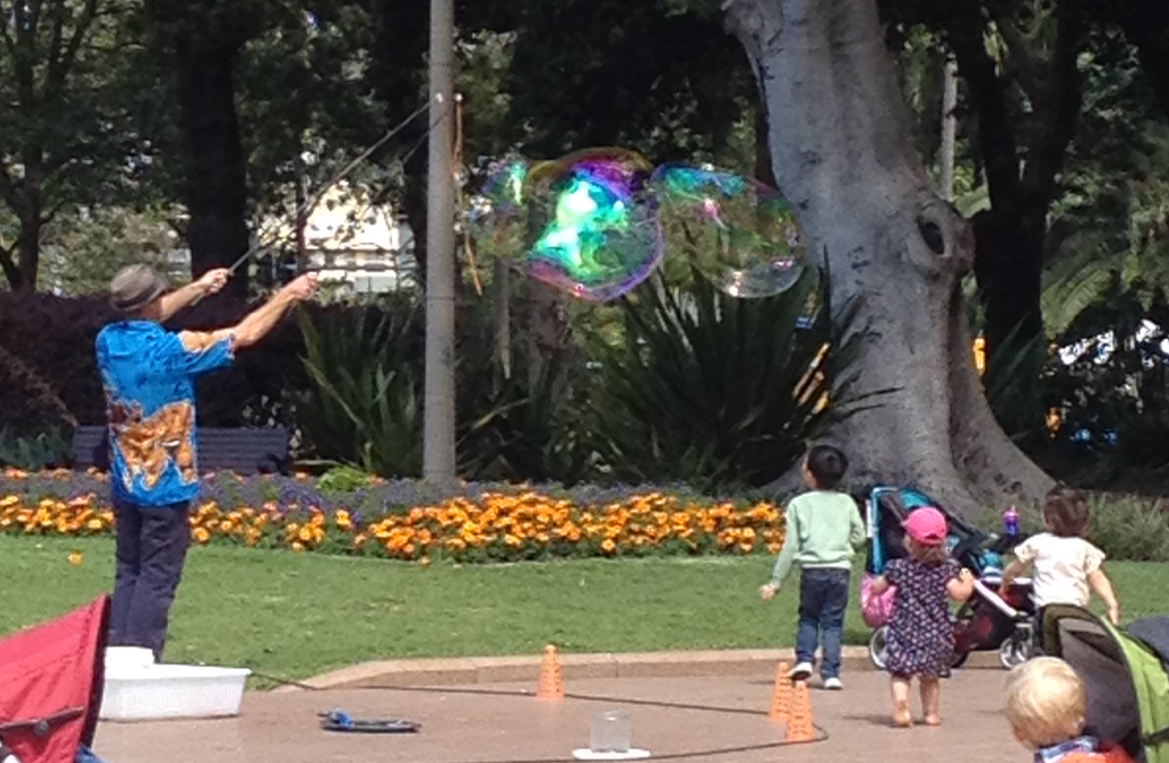 This week I’ve been visiting Sydney, and today I got to experience a few different scenes of street theatre. Great fun! I saw a man making different shaped bubbles with a large bubble wand, much to the delight of the toddlers who were running back and forth beneath the floating soap globes. I saw a violinist trying out some sort of symphony that unfortunately, he hadn’t quite got memorised yet (busking is a tough gig, no two ways about it).