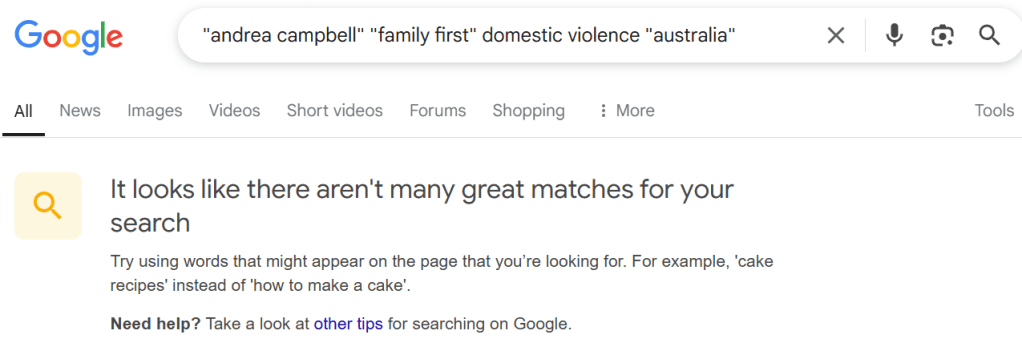 Very confusing, because there’s a candidate in the USA in Giffords (not Griffith in Australia) who is a Campbell who actually does care about domestic violence. But this Andrea Campbell, maybe not so much… Couldn’t find anything at all from them about stopping domestic violence. So please steer clear!